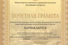 ГАПОУ «Тетюшский сельскохозяйственный техникум» награжден Почетной грамотой Министерства экологии и природных ресурсов Республики Татарстан за победу в конкурсе «ЭКОВЕСНА 2016» в номинации «ЭКОПРЕДПРИЯТИЕ» Тетюшского муниципального района по результатам санитарно-экологического двухмесячника по очистке территорий населенных пунктов Республики Татарстан.
