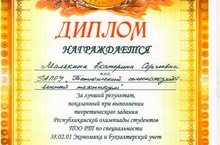 29 апреля 2016 г. студентка 33 группы Малькина Екатерина (руководитель Нестерова Наталья Борисовна) приняла участие в Республиканской олимпиаде студентов ПОО РТ по специальности 38.02.01 «Экономика и бухгалтерский учёт» (по отраслям), которая проходила на базе Лаишевского технико – экономического техникума.