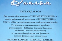 Вокальное объединение «Лунный кораблик» и хореографический коллектив «Линия танца» МБОУ ДОД «Центр дополнительного образования детей Тетюшского муниципального района РТ» (руководители – Зяббарова Э.Н., Ведьгаева С.В.) награждены дипломом за участие в Республиканском фестивале детских фольклорных коллективов «Монлы тамчы» - «Звонкая капель».