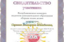 Свидетельством участника Министерства образования и науки Республики Татарстан Республиканского конкурса педагогов дополнительного образования «Сердце отдаю детям» награждена Сергеева Екатерина Михайловна, педагог Центра дополнительного образования детей в номинации «Художественно-эстетическая».