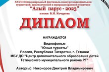 Педагог Центра дополнительного образования Никоноров Д.В. награжден Дипломом 1 степени 28 Международного фестиваля-конкурса видеофильмов туристской, краеведческой и природоохранной тематики «Алый парус-2023» имени В.Н. Кочурова в номинации «Визитные карточки» категория «Педагоги».