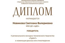 Методист технического творчества Центра дополнительного образования Новикова С. В. стала победителем во II Региональном конкурсе технического творчества «ПрИнТ» в номинации «Рассказ или стихотворение». Конкурс был организован с целью популяризации технического творчества среди обучающихся и взрослого населения Республики Татарстан. Организаторами мероприятия являются МКУ «Управление образования Исполнительного комитета Елабужского муниципального района» и ООО «Торгово-производственная компания МТЗ-Татарстан».