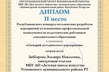 Зяббарова Эльмира Наильевна, заведующая отделом по методической работе Центра дополнительного образования стала дипломантом II степени Республиканского конкурса методических разработок мероприятий по повышению профессиональной компетентности педагогических работников дополнительного образования.