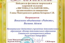 Воспитанница вокального объединения «Радость» Валиева Айзиля (руководитель Филиппова Н.А.), приняла участие в Региональном фестивале творческой и одаренной молодежи «Листопад талантов 2020», и была награждена дипломом Победителя! Мы желаем , чтобы ваш творческий путь был интересным, запоминающимся и лучшим для вас и вашего педагога. Поздравляем с победой и желаем новых достижений!