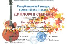 В нашем Центре дополнительного образования, ребята занимаются вокалом, а также практикуются игре на гитаре. Воспитанник вокального объединения «Радость» Нестеров Дмитрий (руководитель Филиппова Н.А.), принял участие в Республиканском конкурсе «Осенний рок-н-ролл» и стал дипломантом II степени! Желаем дальнейших творческих успехов и побед!