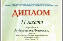 Мубаракшина Анастасия, обучающаяся объединения «Мир игрушек» (педагог Глотова Г.Г.), награждена дипломом 2 степени Республиканского конкурса детского творчества «Таланты Татарстана», посвященного 100-летию образования ТАССР. Конкурс проводился в целях развития художественно-эстетического творчества детей и подростков, а также воспитания бережного отношения и уважения к национальной культуре, национальным традициям народов Республики Татарстан.