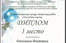 Дипломами I степени VI Республиканского конкурса творческих работ «Новогодняя сказка» награждены Даньшина Вероника и Даньшина Виктория, обучающиеся объединения «Мир игрушек» (педагог Глотова Г.Г.). Конкурс проводился в целях сохранения и развития традиционной художественной культуры, повышения интереса к традициям празднования Нового года и Рождества.