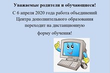 С 6 апреля работа объединений ЦДО переходит на дистанционную форму обучения. Занятия будут проводиться на различных интерактивных платформах. Режим работы и формы образовательной деятельности объединения, которое посещает обучающийся, можно узнать у его руководителя, а также по ссылке