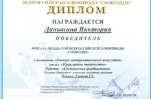Обучающиеся Центра дополнительного образования объединения «Мир игрушек» (педагог Глотова Г.Г.) стали победителями и призёрами XX Всероссийской Олимпиады учебных и научно-исследовательских проектов детей и молодежи «Созвездие - 2019», посвящённой 85-летию Юрия Алексеевича Гагарина. Дипломами Победителей в номинации «Конкурс изобразительного искусства» награждены Даньшины Вероника и Виктория, а Сайфутдинова Расиля награждена Дипломом призёра в этой же номинации.