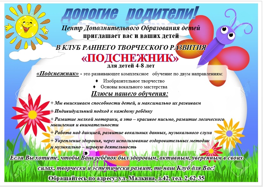 Опубликовано: 23.08.2017Дорогие родители! Центр дополнительного образования детей приглашает Вас и ваших детей в клуб раннего творческого развития "Подснежник" для детей 4-8 лет.