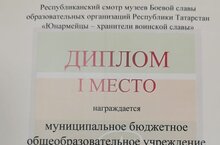 Дипломом за 1 место в Республиканском смотре музеев Боевой славы образовательных организаций Республики Татартсан "Юнармейцы - хранители воинской славы" награждена наша школа.