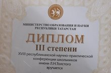 Ученица нашей школы Ярандаева В. стала дипломантом 3 степени XIII республиканской научно - практической конференции школьников имени Л.Н.Толстого (рук.Л.Мухаметшина)