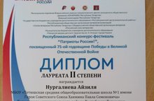 2-3 ноября ученица 10 класса МБОУ «Тетюшская СОШ №1 им.Ханжина П.С.», юнармеец Нургалеева А приняла участие в Республиканском конкурсе фестивале Патриоты России, посвящённого 75-ой годовщине Победы в Великой Отечественной войне, где стала лауреатом 2 степени. Желаем удачи и дальнейших успехов.