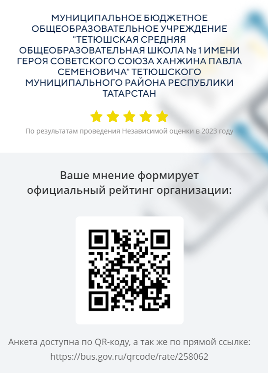 Муниципальное бюджетное общеобразовательное учреждение «Тетюшская средняя общеобразовательная школа №1 имени Героя Советского Союза Ханжина Павла Семеновича» Тетюшского муниципального района Республики Татарстан - «Школа-центр компетенции в электронном образовании»/Татарстан Республикасы Тәтеш муниципаль районы «Советлар Союзы Герое Ханжин Павел Семенович исемендәге Тәтеш 1нче урта гомуми белем бирү мәктәбе» муниципаль бюджет гомуми белем бирү учреждениесе