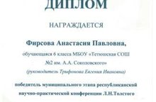 Победителем муниципального этапа республиканской научно-практической конференции Л.Н.Толстого признана обучающаяся 6Б класса Фирсова Анастасия (руководитель Трифонова Евгения Ивановна). Поздравляем с победой и желаем новых творческих достижений!