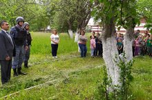 В это время к школе на пожарной машине подъехал пожарный расчет, развернули рукава и отправились к условному месту возгорания. По завершению учебных действий пожарные продемонстрировали детям работу пневматического гидродомкрата.