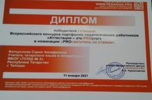 Поздравляем Фаткуллову Сарию Ханафиевну(учитель родного языка и литературы ) с победой во Всероссийском конкурсе портфолио педагогических работников “Аттестация – это PROсто!” в номинации «PROсветитель со стажем». Желаем дальнейших творческих побед.
