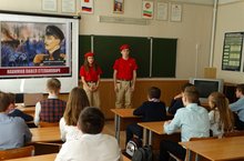 Юнармейцы школьного отряда «Патриоты России» провели агитационную бригаду «Герои Отечества» для 7-х классов, на которой ребята рассказали о Суворове А.В., Кутузове М.И., Нахимове П.С. и Барклай де Толли М.Б.