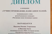 Классный руководитель Михеева И. Ю., коллектив учащихся 4 Б класса и их родители поздравляют Павлову Оксану Георгиевну с победой в муниципальном этапе Всероссийского конкурса «Читающая мама – читающая страна» в номинации «Лучшее произведение, написанное мамой» и желают дальнейших творческих успехов!