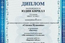 Юдин Кирилл, учащийся 3 Б класса (классный руководитель Михеева И.Ю.), награждён дипломом Всероссийского образовательного портала «ИКТ педагогам» за 1 место в международном конкурсе декоративно-прикладного творчества «Сказки Пушкина» в номинации «Рисунок» в возрастной категории «Обучающиеся 1-4 классов». Поздравляем!!!