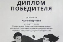 Ученица 7Б класса Портнова Карина (учитель Мамкина Т.Г.) приняла участие во Всероссийской онлайн-олимпиаде Учи.ру по русскому языку для 5-11 классов и завоевала Диплом победителя. Мы поздравляем Карину с достойной победой и желаем ей дальнейших успехов в постижении тайн языкознания.
