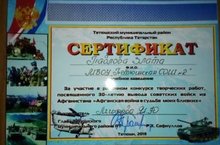 Павлова Злата, ученица 2 Б класса (классный руководитель Михеева И. Ю.), получила сертификат участия в районном конкурсе творческих работ (рисунок), посвящённого 30-летию вывода советских войск из Афганистана «Афганская война в судьбе моих близких». Молодец!