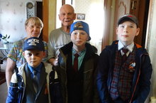 На фотографии труженик тыла Тимирясов Вячеслав Гайнуллович с супругой и Тимуровцы 4б класса.