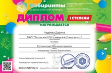 В апреле 2025 года стартовал Всероссийский конкурс по основным школьным предметам «Лабиринты». Авдеева Дарина, ученица 6 класса, приняла участие в конкурсе по русскому языку и награждена Дипломом I степени. Руководитель – учитель русского языка и литературы Кондакова Г.В.