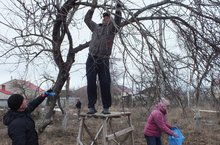 Фиргат Файзулхакович быстро и умело поделил класс на две команды и дал поручение: первая группа раскидывает снег и убирает прошлогодний мусор, а вторая спиливает сухие ветки на яблонях. Папы – Икононов В., Панов А., Нагуськин Ю., Пирогов А., Голод Р. - взялись за ножовки и показали мальчикам пример, как определить сухую ветку от плодоносящей, безопасно спилить её.