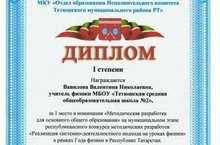 Учитель физики Вавилова В.Н. заняла первое место в номинации «Методическая разработка для основного общего образования» на муниципальном этапе республиканского конкурса методических разработок «Реализация системно-деятельностного подхода на уроках физики в рамках Года физики в Республике Татарстан.
