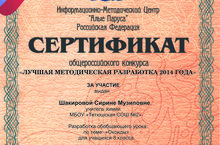 Сертификат за участие в общероссийском конкурсе «Лучшая методическая разработка 2014 года» вручен учителю химии Шакировой С.М. за разработку обобщающего урока по теме «Оксиды» для учащихся 8 класса.