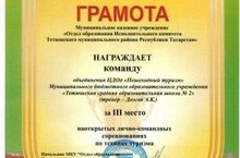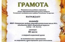 Муниципальное казенного учреждение «Отдел образования исполнительного комитета Тетюшского муниципального района РТ» награждает команду объединения ЦДОд муниципального бюджетного образовательного учреждения «Тетюшская средняя общеобразовательная школа №2» «Пешеходный туризм» (тренер - А.К. Долгов), за III место на открытых лично-командных соревнованиях по технике туризма.