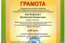 Муниципальное казенного учреждение «Отдел образования исполнительного комитета Тетюшского муниципального района РТ» награждает Костягина Станислава, ученика 10 класса МБОУ «Тетюшская средняя общеобразовательная школа №2» обучающегося объединения ЦДОд «Пешеходный туризм» (тренер - А.К. Долгов), за III место в личном первенстве среди юношей на открытых лично-командных соревнованиях по технике туризма.