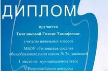 МКУ «Отдел Образования Исполнительного комитета Тетюшского муниципального района РТ» Дипломом наградил Тинглякову Галину Тимофеевну, учителя начальных классов МБОУ «Тетюшская средняя общеобразовательная школа №2», занявшую I место на муниципальном этапе V Всероссийского конкурса «Учитель здоровье России – 2014»