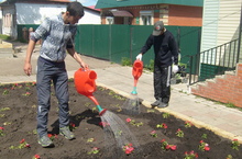 Ребята из "Трудового десанта" мобильны и быстры. Они не боятся работы. Для того чтобы родной город утопал в цвету, каждый должен внести свою лепту - так считают ребята. Полив цветочных клумб в центре города...