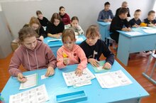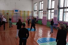 "Каникулы с пользой" в спортивном зале школы. Сегодня ребята соревнуются в игре волейбол.