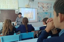 Учитель истории Саттыева С.Н. провела для учащихся информационно-патриотическую беседу ко Дню воссоединения Донбасса с Россией.