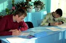 Учащиеся 9 класса выполняют пробный экзамен по обществознанию.