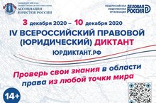 В период с 3 по 10 декабря 2020 года проводится Четвертый Всероссийский правовой (юридический) диктант (далее - Диктант). Соорганизаторами Диктанта выступают Общероссийская общественная организация «Ассоциация юристов России» и Общероссийская общественная организация «Деловая Россия» при поддержке Федерального государственного бюджетного образовательного учреждения высшего образования «Московский государственный юридический университет имени О.Е. Кутафина (МГЮА)».