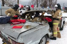 Команды основного состава осуществляют аварийно-спасательные работы при ДТП на тренажёре "Деблокатор" -