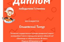 Студент 1 курса специальности Пожарная безопасность Ельшевский Тимур занял 1 место в мероприятии проекта videouroki .net «Олимпиада по обществознанию», набрав 65 баллов из 65 возможных. Руководитель талантливого студента -преподаватель обществознания колледжа Юлия Олеговна Осокина. Коллектив колледжа поздравляет курсанта и педагога, желает дальнейших творческих побед!