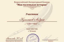 Член литературного клуба «Вдохновение» ГАОУ СПО «Тетюшский педагогический колледж» (руководитель Ханзярова М.С.) –студент 4 курса- Кутяшов Андрей награжден Дипломом участника Всероссийского литературного конкурса «Моя маленькая история». Конкурс проводился в рамках деятельности литературно-образовательного портала «ЛитОбраз». 28 июня будут подведены итоги Всероссийского литературного конкурса « Слова победы», где Андрей также принял активное участие.