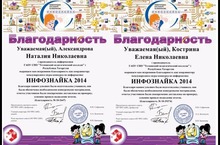 Преподаватели Тетюшского педагогического колледжа Александрова Наталья Николаевна и Кострина Елена Николаевна награждены Благодарственными письмами оргкомитета международной игры-конкурса по информатике ИНФОЗНАЙКА-2014 за успешную подготовку студентов к конкурсу.
