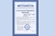 Руководство Института педагогики и образования К(П)ФУ в лице директора, доктора педагогических наук , профессора Калимуллина А.М. и заведующего кафедрой методологии обучения и воспитания ИПО КФУ, доктора педагогических наук, профессора, академика РАГН Хузиахметова А.Н. наградило Благодарственным письмом педагогический коллектив Тетюшского педагогического колледжа за творческую инициативу, привлечение учащихся в учебно-исследовательскую, интеллектуально-творческую деятельность.