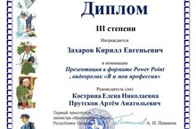 Дипломом III степени Республиканского фестиваля «Я и моя профессия» среди студентов с ОВЗ профессиональных образовательных организаций Республики Татарстан в номинации «Презентация в формате Power Point, видеоролик «Я и моя профессия» награжден студент 211 группы специальности «Эксплуатация беспилотных авиационных систем» Захаров Кирилл.