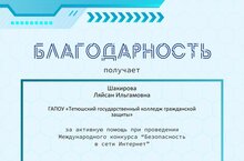 Поздравляем наших студентов и их талантливого молодого педагога, преподавателя информатики, Ляйсан Ильгамовну Шакирову, с победой в международном конкурсе "Безопасность в интернете" и желаем успехов в дальнейшем!