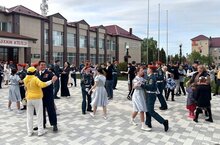 Сегодня, на площади, перед районным Домом культуры, студенты колледжа закружились в вальсе под звуки песен военных лет, отдавая дань памяти и уважения тем, кто отстоял мирное небо над головой в годы Великой Отечественной войны.