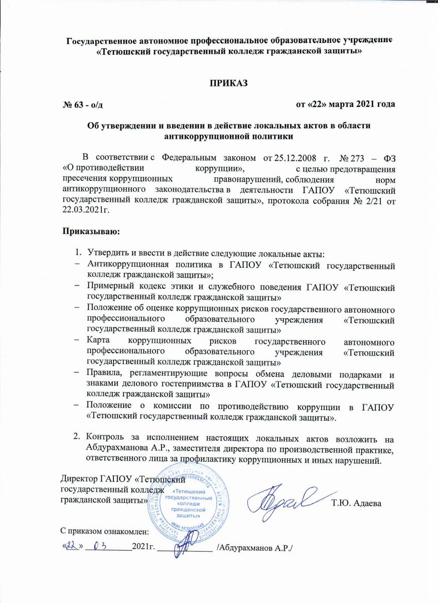 Приказ об утверждении и введении в действие локальных актов в области антикоррупционной политики
