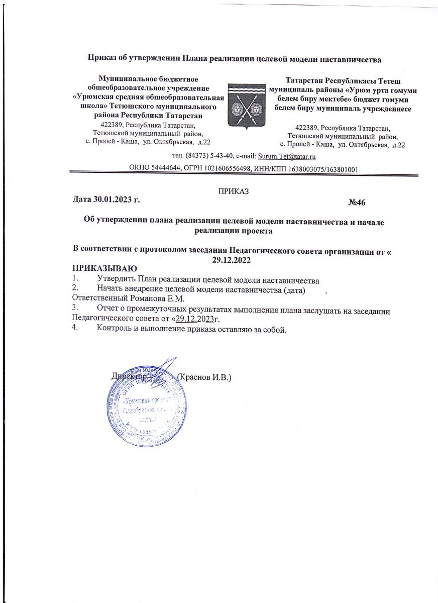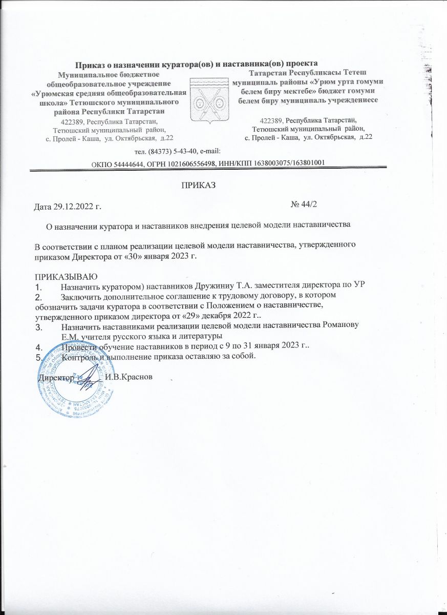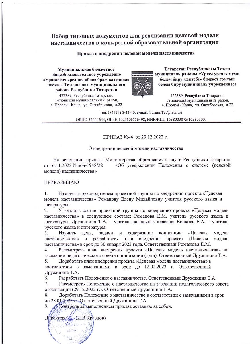 Приказ от 29.12.2022 г. О внедрении целевой модели наставничества