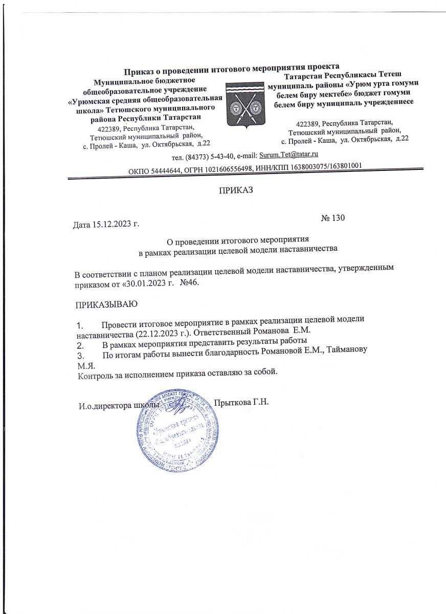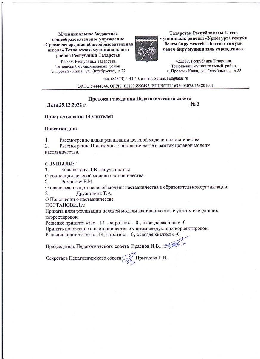 Муниципальное бюджетное общеобразовательное учреждение «Урюмская средняя общеобразовательная школа» Тетюшского муниципального района Республики Татарстан